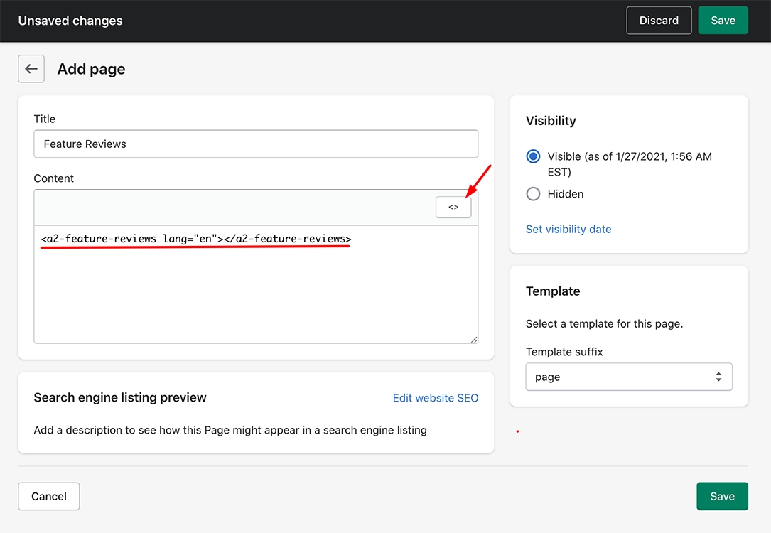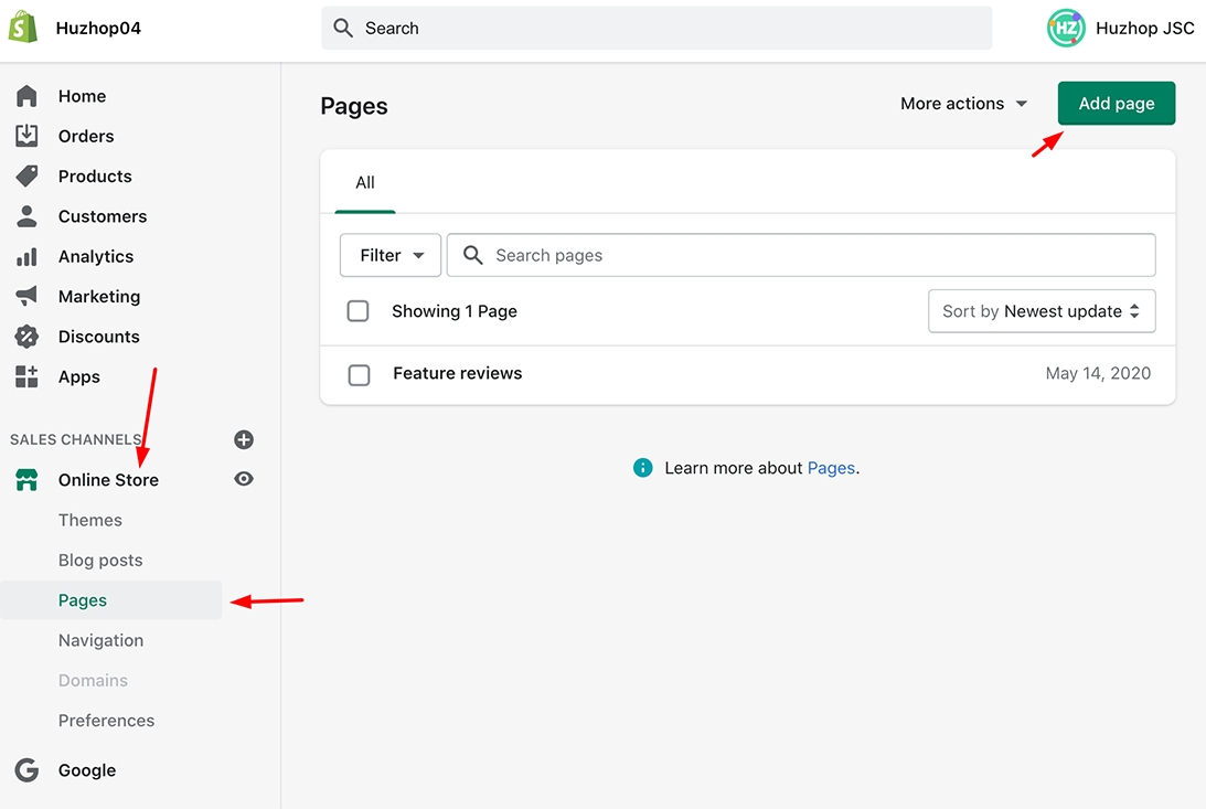 1. In your admin store page, on the left sidebar menu, click on “Online Store > Pages” 2. Click the “Add Page” button 3. Add the title for this page for example, “Feature reviews”
